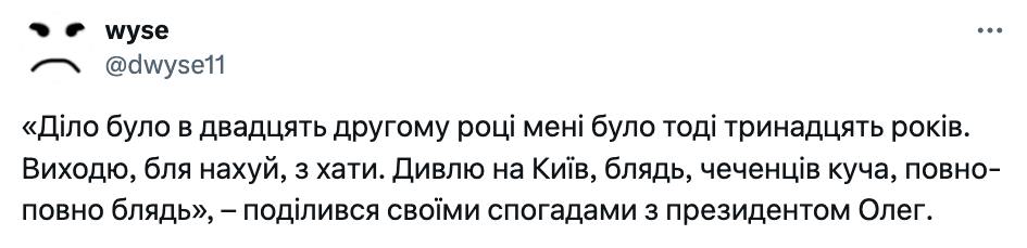 - Та ми тут під Києвом чеченців штабелями ріжемо! Санич, вони на нас йдуть танками, а ми всередину цих бляшанок залазимо і вирізаємо їх до біса! Володя, не переживай, сиди у себе в офісі, ми їх стримаємо! Санич, я…