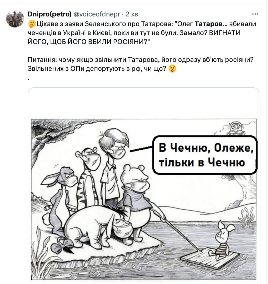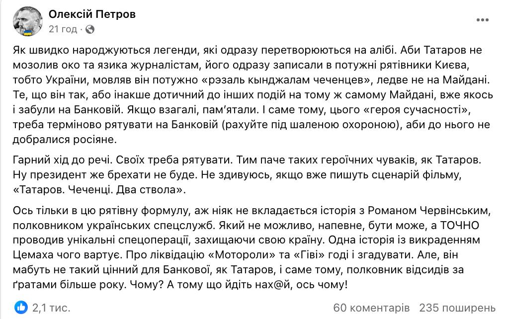 "Гарний хід до речі. Своїх треба рятувати. Тим паче таких героїчних чуваків, як Татаров. Ну президент же брехати не буде. Не здивуюсь, якщо вже пишуть сценарій фільму, «Татаров. Чеченці. Два ствола»", - зазначив Петров.