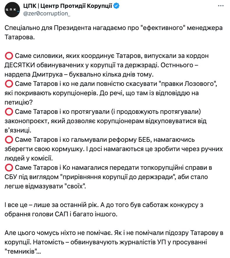 "І все це – лише за останній рік. А до того був саботаж конкурсу з обрання голови САП і багато іншого. Але цього чомусь ніхто не помічає. Як і не помічали підозру Татарову в корупції", - зазначили у ЦПК.
