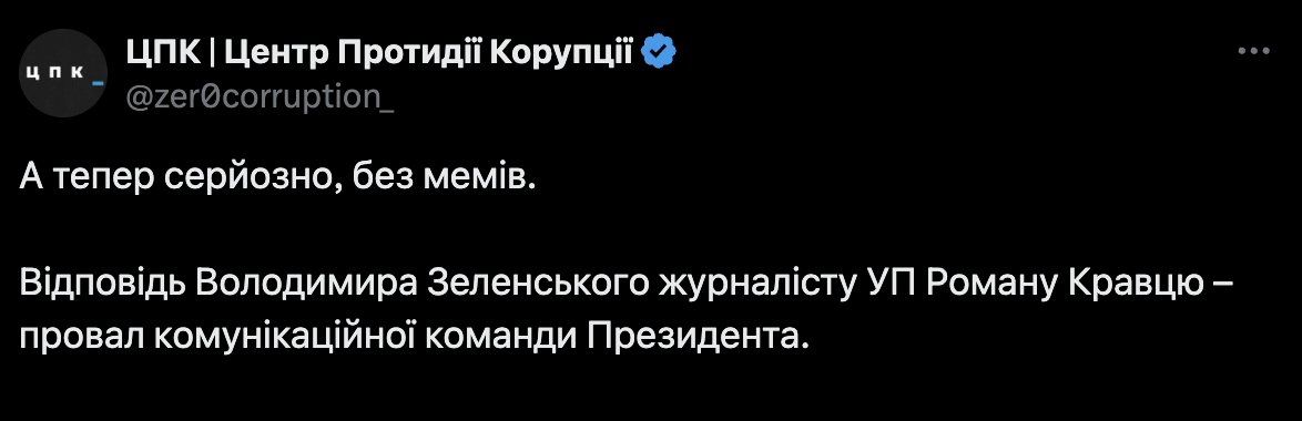 Центр протидії корупції Віталія Шабуніна заявив, що відповідь Зеленського журналісту УП Роману Кравцю – провал комунікаційної команди президента. Він дозволив собі відверто хамити журналісту.