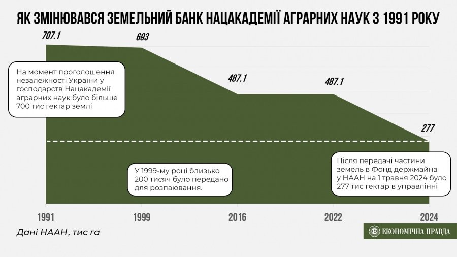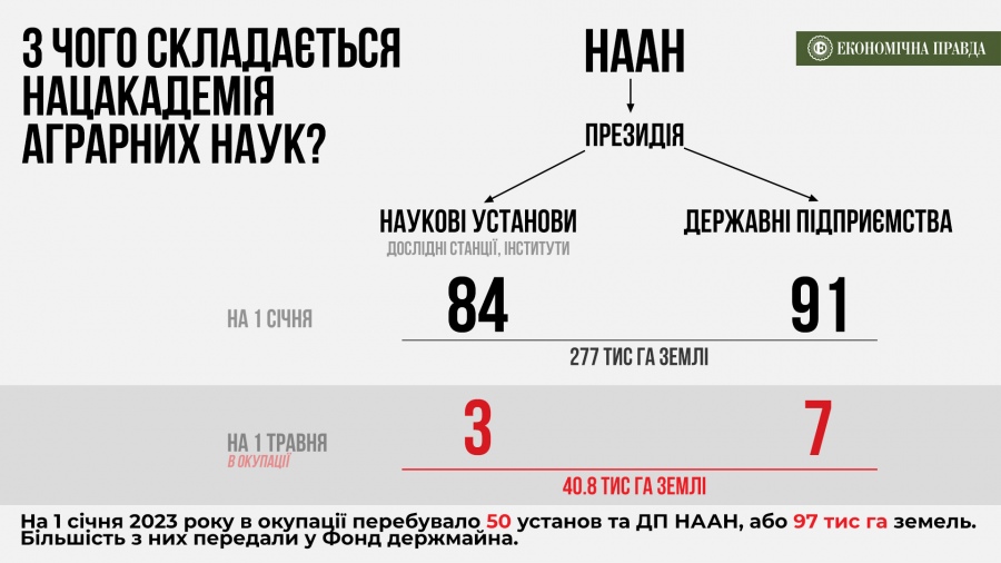 До передавання господарств у Фонд держмайна, яке стартувало у 2023 році, у НААН було близько 270 господарств, у тому числі понад 170 державних підприємств, кожне з яких мало в користуванні від 2 тис до 20 тис га землі.