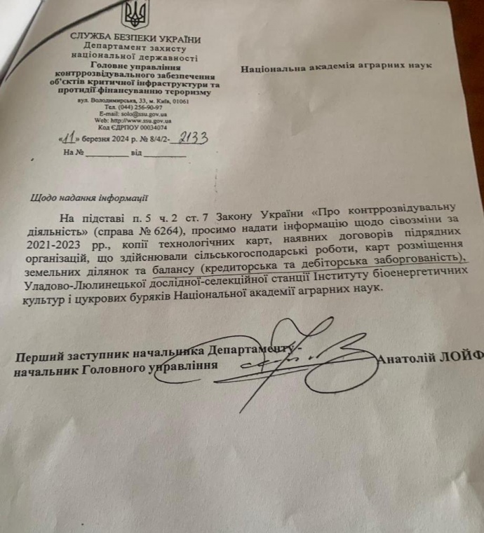 Заступник начальника департаменту СБУ Анатолій Лойф цікавиться сівозмінами, які відбувалися на землях НААН. За даними "Слідство.Інфо", Лойф замінив на посаді Артема Шила, ексочільника так званого економічного підрозділу служби. Журналісти виявили, що мати Лойфа, викладачка іноземних мов, придбала елітну нерухомість у Києві та передмісті.