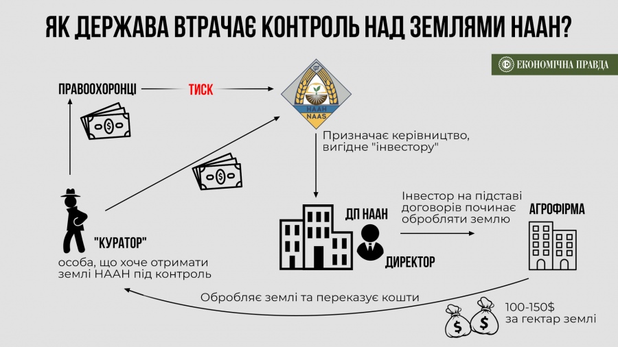 Як це працює? Для доступу до землі потрібен контроль над держпідприємством Нацакадемії, тобто над директором, але його призначає та звільняє керівний апарат НААН. Отже, для отримання контролю "інвестор"-"куратор" має увійти в зговір з керівництвом академії. За словами директора одного з господарств НААН, для цього зазвичай використовується аргумент сили.