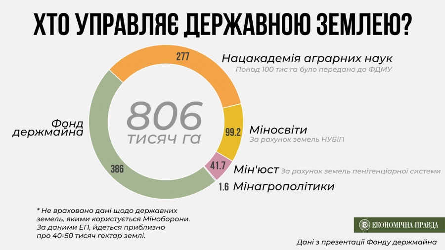 В одному із слайдів презентації зазначається, що з усієї державної землі, яка перебуває в управлінні фонду, 98 тис га обтяжені "судами та кримінальними провадженнями". У Фонді державного майна наразі є 386 тис га землі і з них лише 210 тис га – це господарства, які передала НААН.