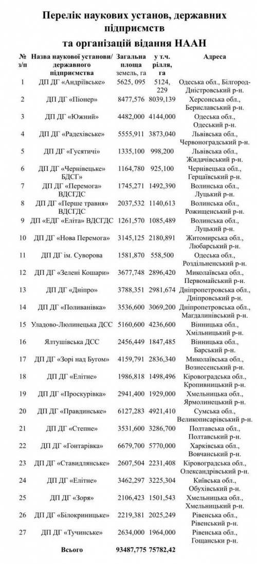 Список підприємств в управлінні НААН, які керівництво академії не контролює. Земельний банк – 93,5 тис га. Ці господарства уряд поки не передає Фонду держмайна.