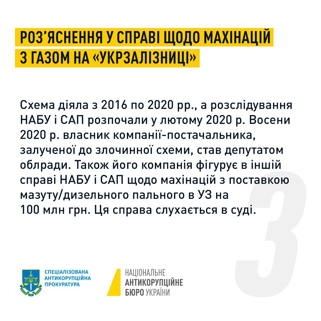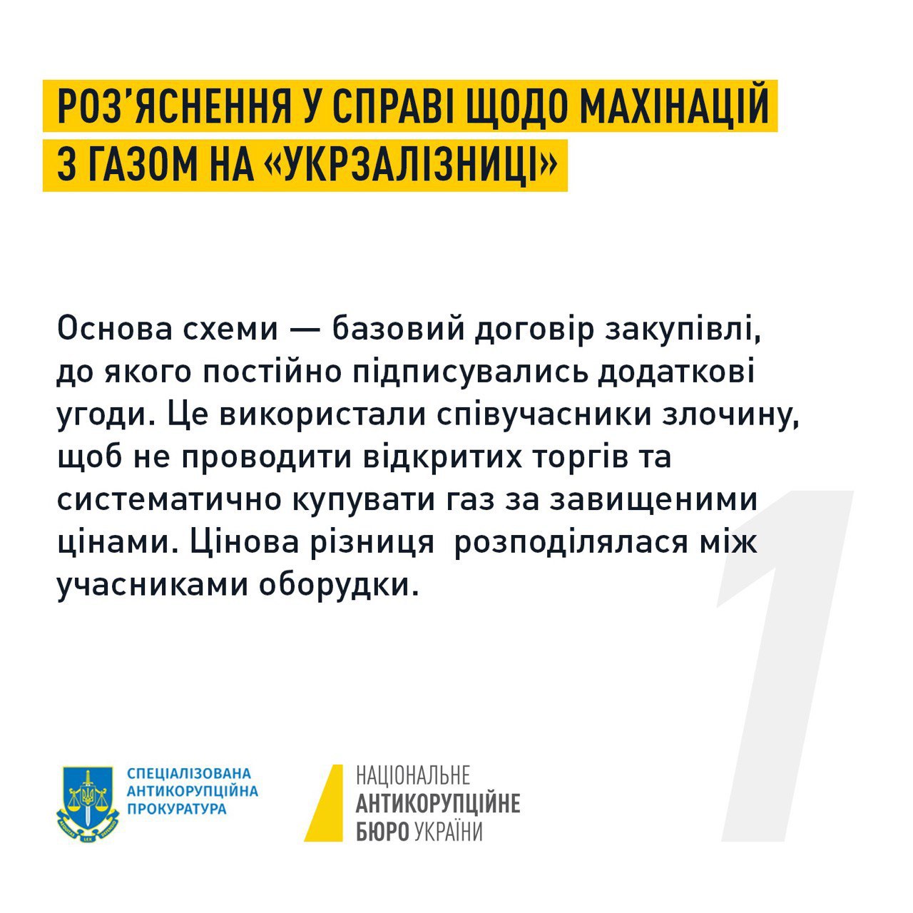 У межах досудового розслідування встановлено, що з грудня 2016 року по січень 2020 року службові особи філії "Центр забезпечення виробництва" АТ "Укрзалізниця" у змові з представниками газових компаній організували закупівлі "блакитного палива" в обхід тендерних процедур, а також узгодили додаткову націнку на постачання газу, яка становила від 200 до 1000 грн на тис. куб. м. При цьому службовці "Укрзалізниці" приховували надходження більш вигідних пропозицій від учасників ринку газу, умисно надаючи перевагу лише двом наперед визначеним компаніям.