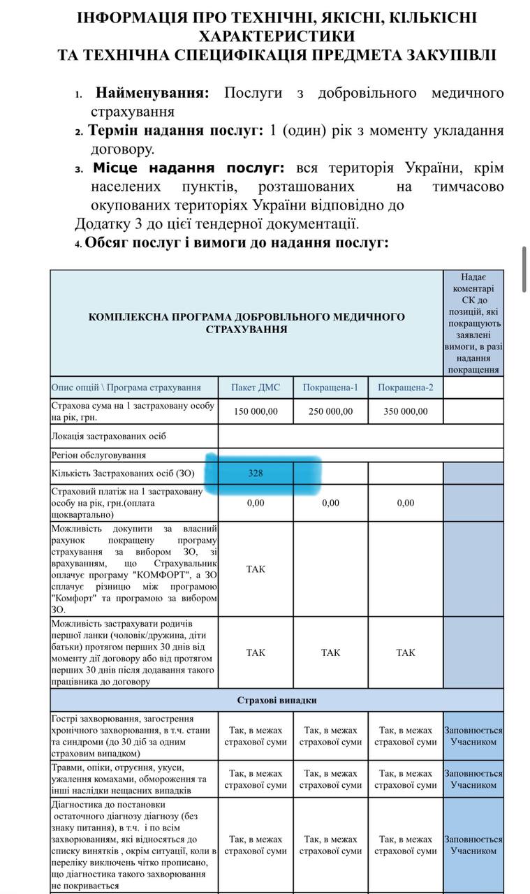 Отже, 6 млн. 380 тисяч гривень запланували витрати для медичного страхування на рік своїх 328 працівників на ВІП-страховки, що включають: перебування і лікування у найдорожчих клініках, стоматологію, масажі, можливість додавати родичів, повне забезпечення ліками, вітамінами, пробіотиками та багато іншого.