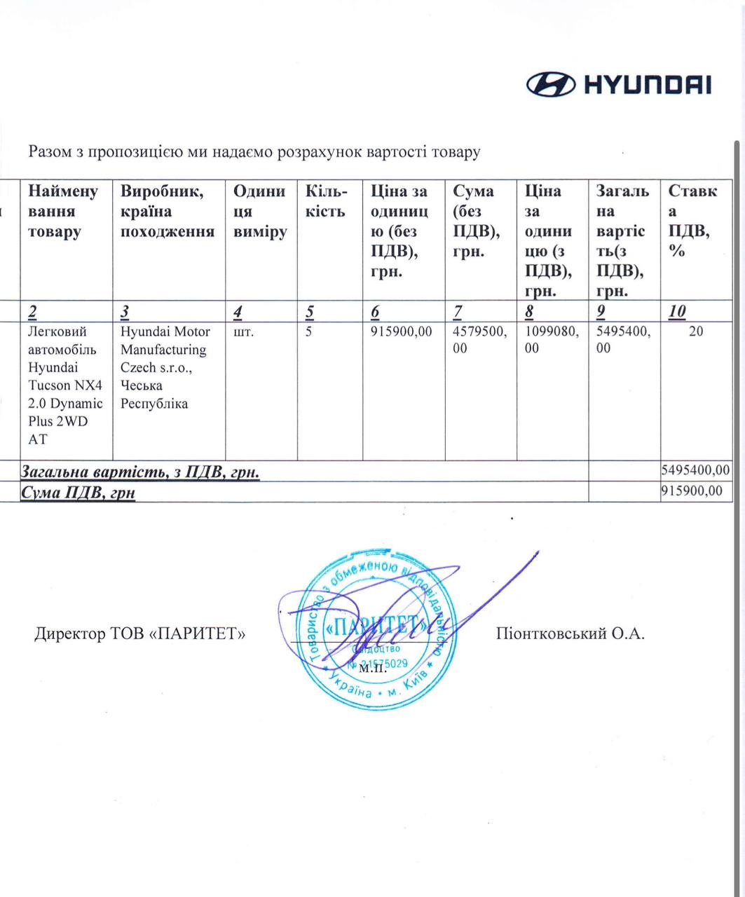 Переміг єдиний учасник - ТОВ «ПАРИТЕТ» з оновленим Hyundai Tucson NX4 2.0, в комплектації Dynamic Plus.