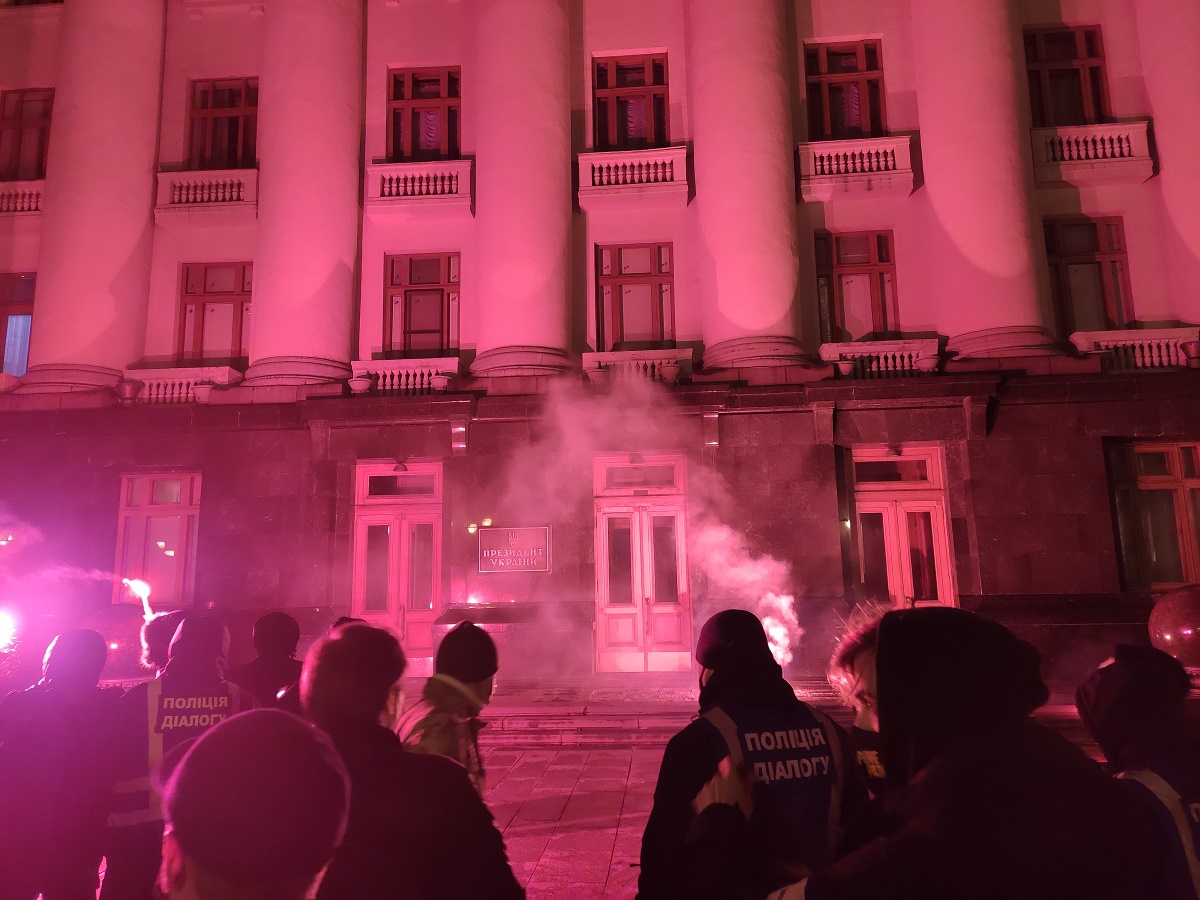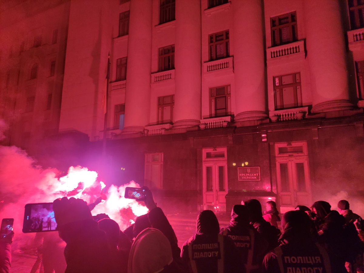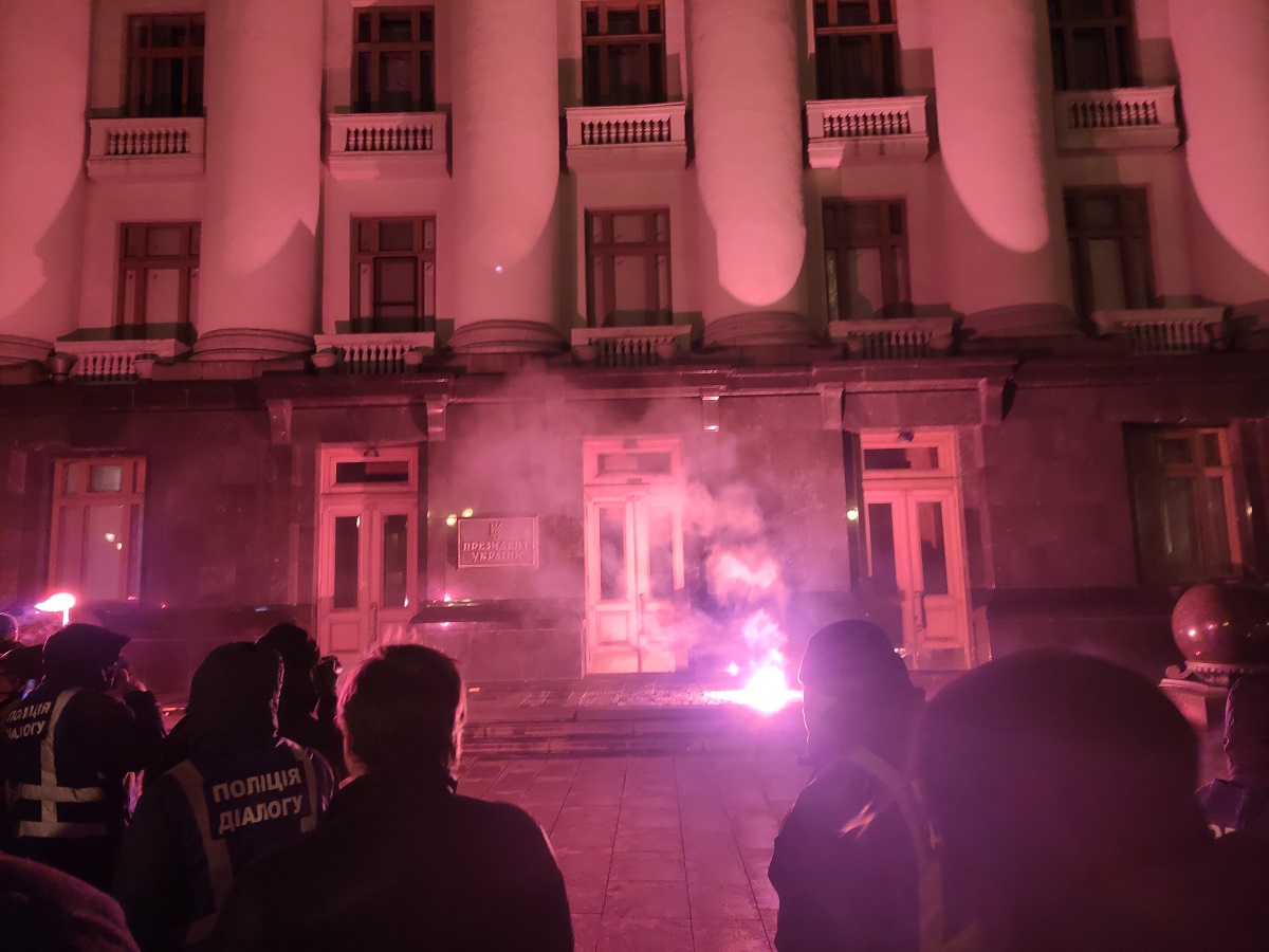 Під час протесту активісти закидали фаєрами, салютами та димовими шашками вхід до будівлі Офісу президента.