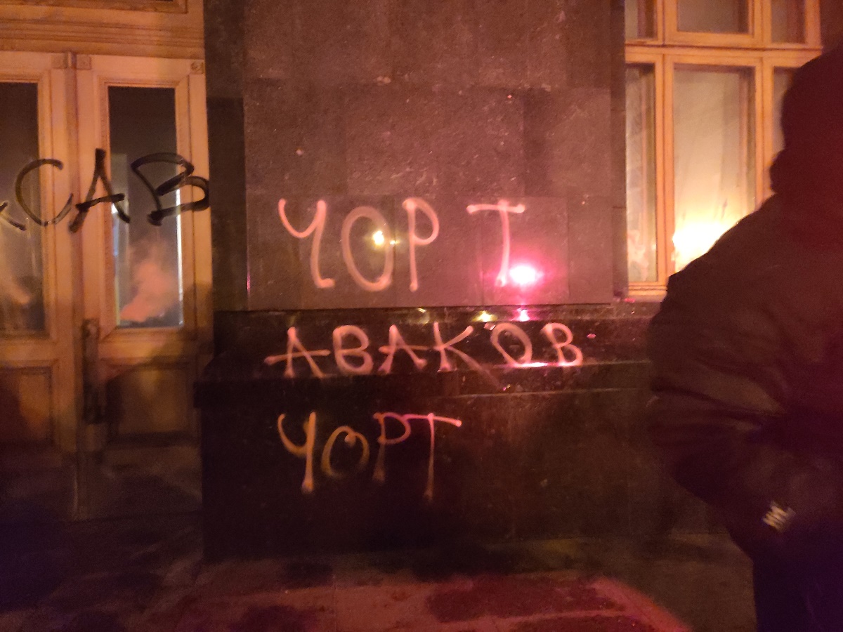 Вхід до будинку також закидали димовими шашками, залили червоною фарбою, розмалювали стіни. Табличку "Офіс президента" на вході спалили.
