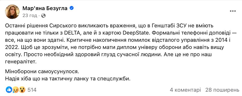 На своїй Facebook-сторінці вона заявила, що останні рішення Сирського викликають враження, що в Генштабі ЗСУ не вміють працювати не тільки з DELTA, але й з картою DeepState.