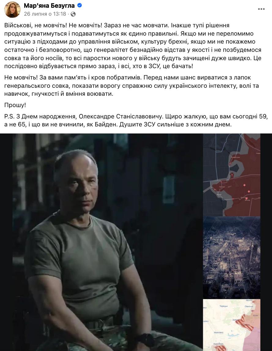 Народна депутатка Марʼяна Безугла знову розкритикувала головнокомандувача ЗСУ Олександра Сирського та накинулася на Генеральний штаб ЗСУ.