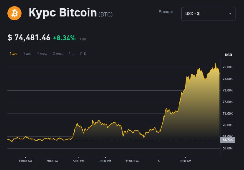Біткоїн оновив свій історичний максимум, наблизившись до позначки $75 000, підскочивши майже на 9% після повідомлень про перевагу Дональда Трампа на виборах у США.