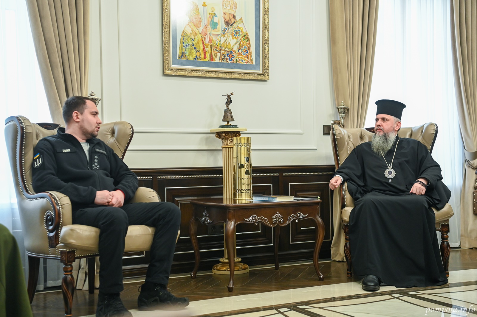 Оприлюднили світлини з цієї зустрічі. На одному з фото присутні розглядають незвичайну ікону. У центрі композиції зображений митрополит Епіфаній, ліворуч від нього – Кирило Буданов, а також інші представники духовенства. Усі постаті на іконі перебувають під покровом Пресвятої Богородиці. Наразі невідомо, хто створив цю ікону та кому її подарували.