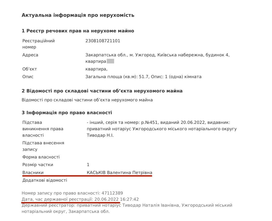 Депутат Закарпатської обласної ради від партії “Опозиційна платформа - За життя” Владислав Каськів придбав квартиру в ЖК “River Land”, що в Ужгороді, та оформив її на свою маму Валентину Каськів, 1948 р.н.