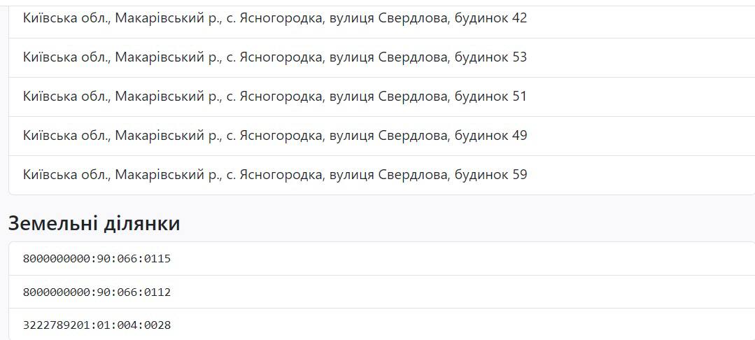 Також у цьому Telegram-каналі повідомили, що на двоюрідного брата Владислава Каськіва, Матковського Олександра Анатолійовича, 1988 р.н., зареєстровано 32 обʼєкти нерухомості та три земельні ділянки в селі Ясногородка, Київської області.