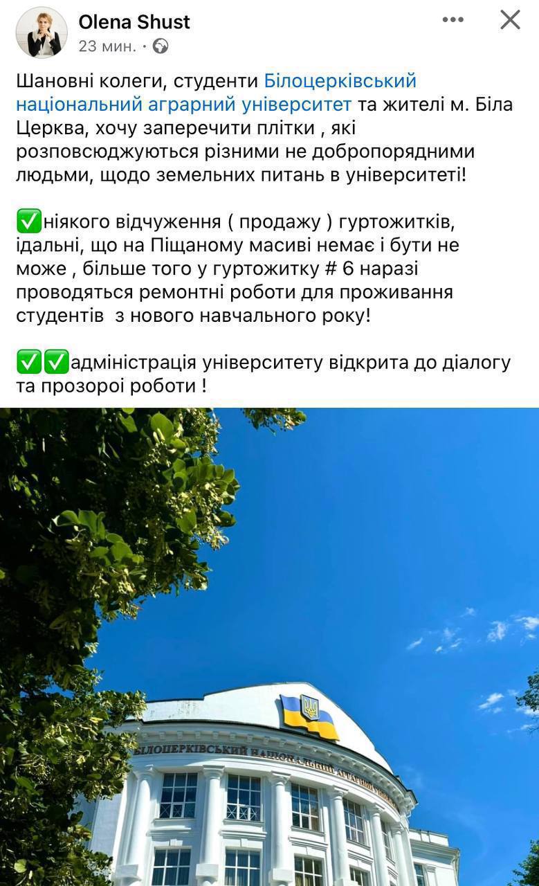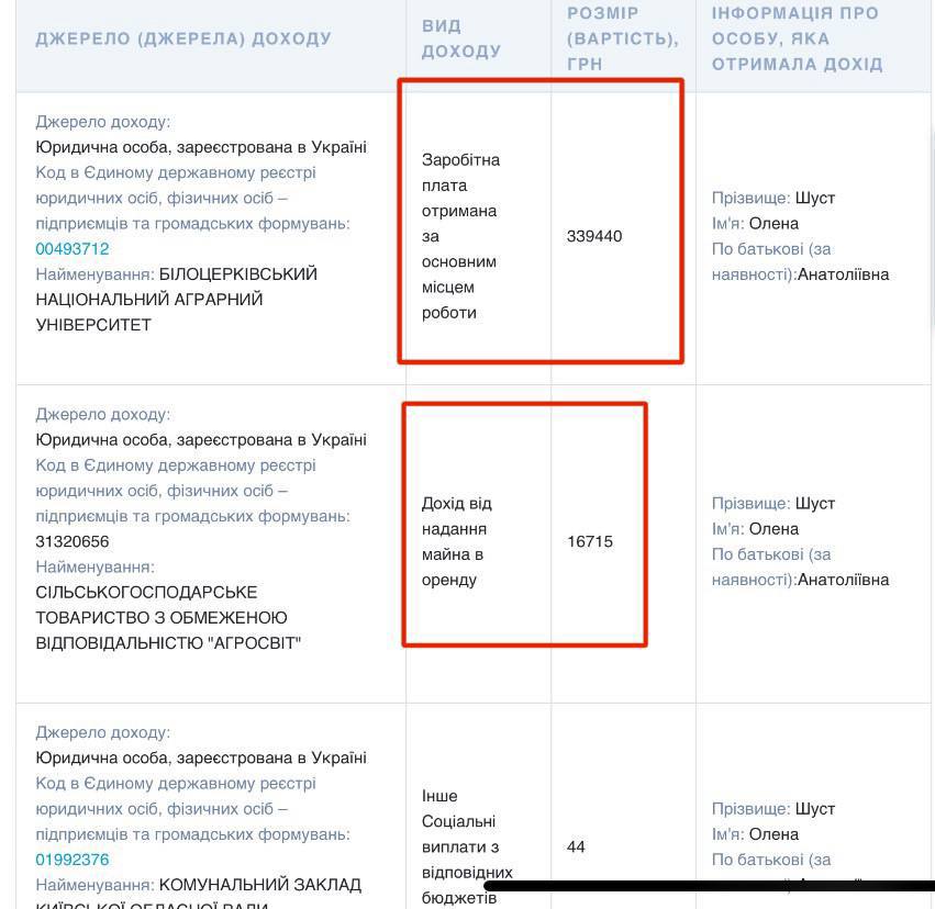 Олена Шуст (Даниленко) - одна з найбагатших аграріїв Київської області з оточення нардепа-корупціонера Анатолія Гунька. Як депутат Київської облради від "Слуги Народу" та ректор Білоцерківського аграрного університету - заробляє мільйони від здачі земель свого університету в тіньову оренду та приховує десятки мільйонів доларів прибутку від свого агропромислового бізнесу (СТВ «Агросвіт», ЄДРПОУ 31320656).