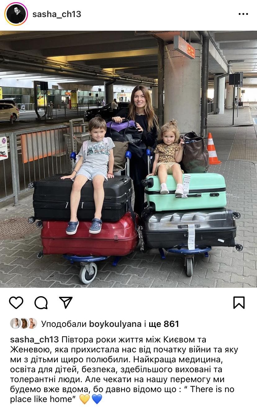 "Півтора року життя між Києвом та Женевою, яка прихистила нас від початку війни та яку ми з дітьми щиро полюбили. Найкраща медицина, освіта для дітей, безпека, здебільшого виховані та толерантні люди. Але чекати на нашу перемогу ми будемо вже вдома, бо давно відомо що : " There is no place like home", - написала Саша 8-го вересня і показалася з валізами та дітьми.