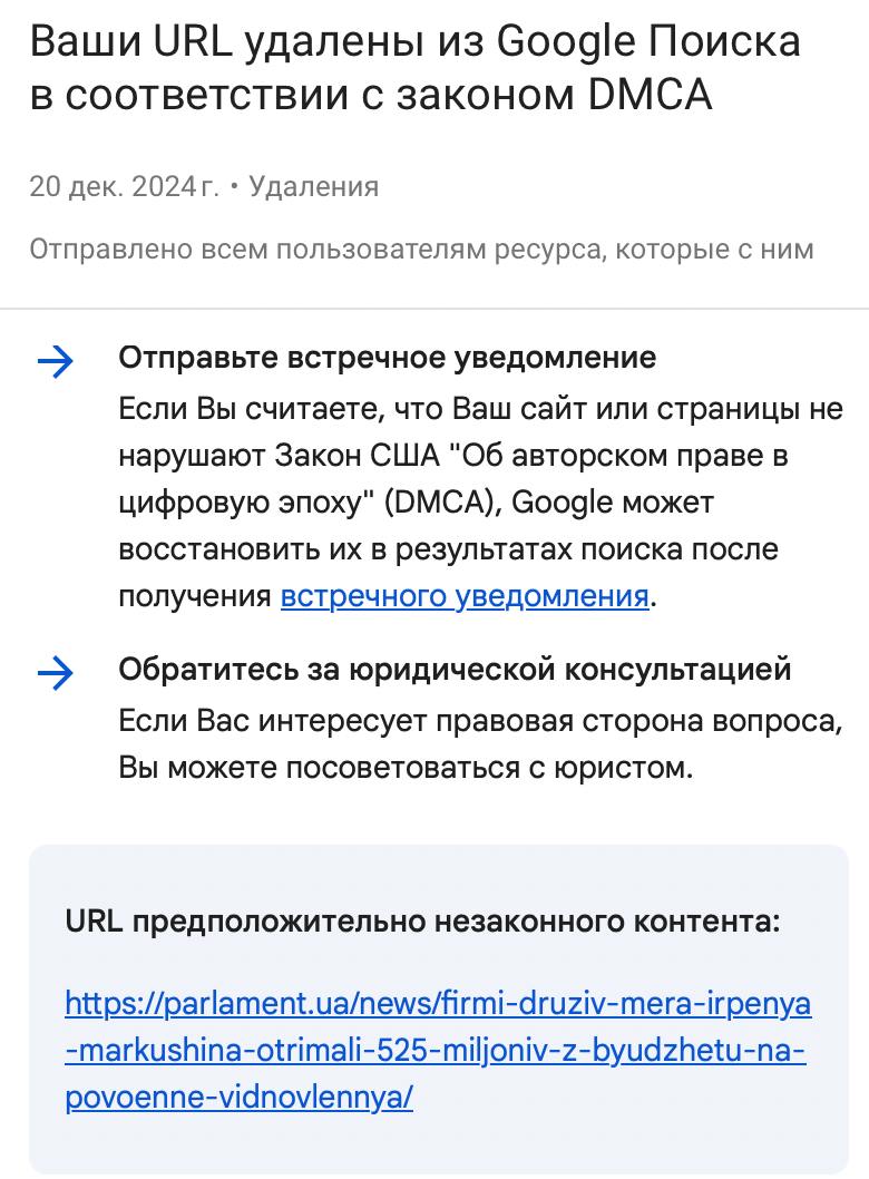 До нашої редакції надійшов лист, в якому пошукова система Google повідомила про відключення індексації пошуку (індексація — це релевантна відповідь на пошуковий запит у пошуковому сервісі. - ред.) статті про фірми друзів мера Ірпеня Олександра Маркушина ОВ "БК Біг Буд Інвест" та ФОП Росстальний Сергій Валерійович, які, стали головними підрядниками з повоєнного відновлення Ірпеня та отримали понад півмільярда грн з місцевих бюджетів та від Уряду Литви. Директором "БК Біг Буд Інвест" був кум мера Ірпеня – Єгор Ярмолич, а після його загадкової смерті керівником стала його дружина – Ангеліна Вовк-Ярмолич. Причиною видалення було "порушення авторських прав", згідно із законами США.