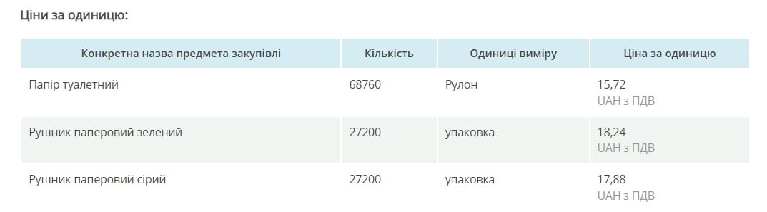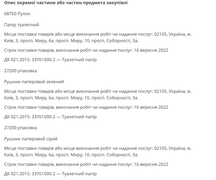 Також стало відомо про ще одну цікаву закупівлю. Туалетного паперу та рушників на 3 мільйони гривень вирішили купити в Дніпровському районі столиці.