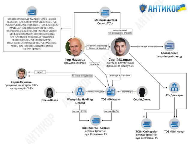 За впертими чутками, власник ТОВ «Юнігран» Ігор Наумець пообіцяв Сергію Шапрану половину бізнесу у разі, якщо той зможе вивести його з-під санкцій та зняти арешти. Правда це чи ні – невідомо, але факт залишається фактом: контроль над компаніями Ігоря Наумця, які займалися здобиччю піску та каменю, перейшов до рук Сергія Шапрана. І цьому не завадили санкції РНБО, ані арешти, накладені судами на майно російського громадянина Ігоря Наумця. Тепер же арешти потихеньку знімаються через те, що змінився власник активів, а санкції щодо Ігоря Наумця стають простим папірцем і порожнім звуком.