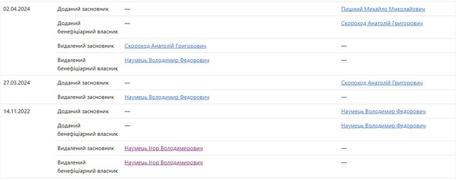 До 2 квітня 2024 року бенефіціаром компанії був Володимир Наумець, а Ігор Наумець із числа бенефіціарів вийшов 14 листопада 2022 року.