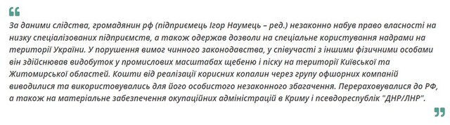 Чому це відбувається? Тому що Ігор Наумець зумів оминути як санкції, так і арешти активів. У цьому йому допоміг ексдепутат Броварської міської ради від партії "За майбутнє" Сергій Шапран. Ще у 2022 році, після втечі Ігоря Наумця до Росії, Шапран став тіньовим куратором його бізнесу в Україні та активно включився у розблокування видобутку корисних копалин у Житомирській області, а потім почав підминати активи Наумця під себе.
