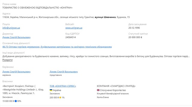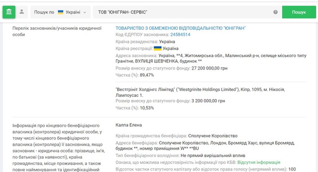 ТОВ «Юнігран-сервіс» є співвласником ТОВ «Юнігран» (частка 1%). Але власником самого ТОВ "Юнігран-сервіс" є ТОВ "Юнігран" (89,47%) та Westgrinite Holdings Limited (10,53%). А кінцевим бенефіціаром є Олена Калпа: