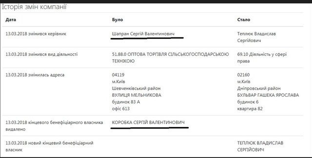 До 2018 року Сергій Валентинович Шапран носив прізвище Коробка, про це свідчить витяг з реєстру щодо ТОВ «Перший український міжнародний траст-капітал» (код ЄДРПОУ 35135332), де до 2018 року Шапран Сергій Валентинович, він же Коробка Сергій Валентинович був кінцевим бенефіціарним власником.