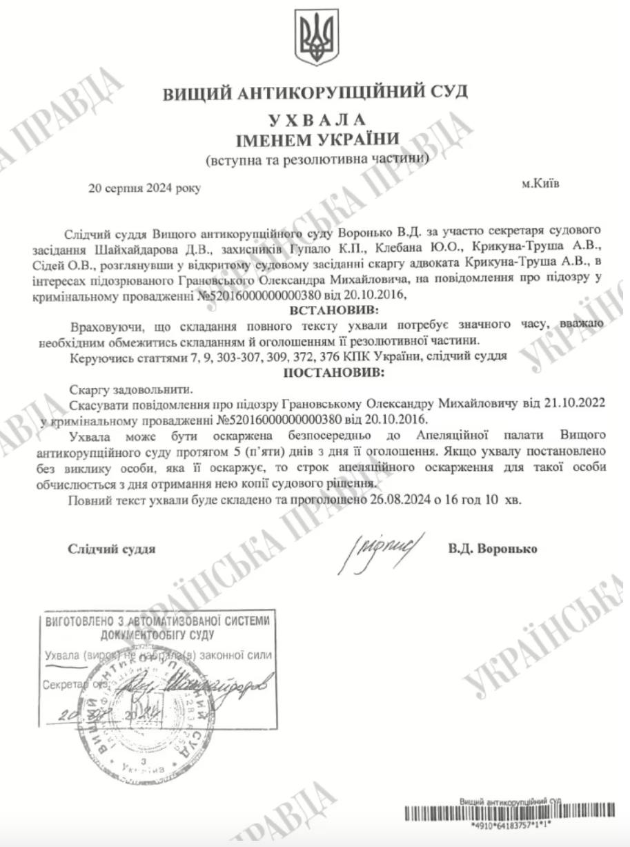 "Скасувати повідомлення про підозру Грановському Олександру Михайловичу від 21.10.2022 у кримінальному провадженні Nº52016000000000380 від 20.10.2016", - йдеться у повідомленні.