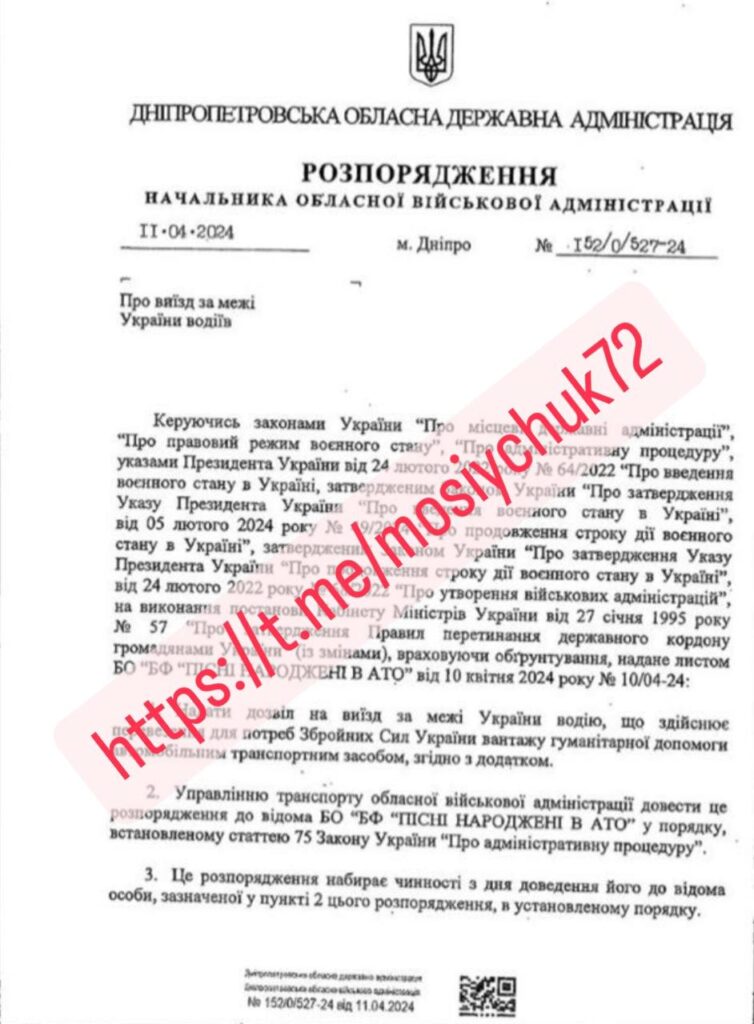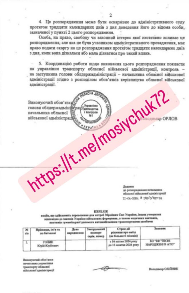 11 квітня 2024 року перший заступник голови Дніпропетровської ОДА Володимир Орлов підписав документ, згідно з яким Голик мав би до 16 жовтня 2024 року перевозити вантажі для ЗСУ.