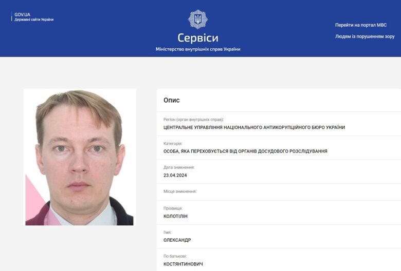 Національне антикорупційне бюро оголосило в розшук колишнього голову Держгеокадастру Олександра Колотіліна і ще одного фігуранта Сергія Кацуна у межах справи ексміністра аграрної політики та продовольства Миколи Сольського.