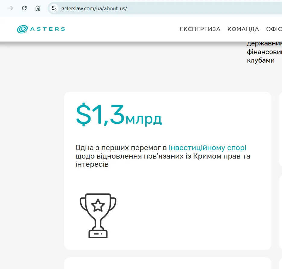 "Астерс", зважаючи на інформацію на їхньому сайті, і зараз вважає, що їхня участь у виграші $1,3 млрд для "Ощаду" – чи не найважливіша подія в житті компанії. Про це досягнення повідомляють на сторінці "Астерс" як про ключове. Однак при цьому юристи на своїй сторінці не уточнили, що насправді це перемога американської компанії Quinn Emanuel Urquhart & Sullivan, якій вони допомагали.
