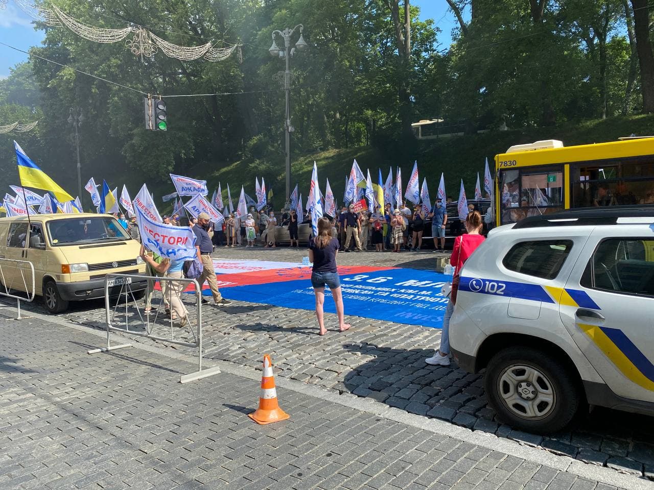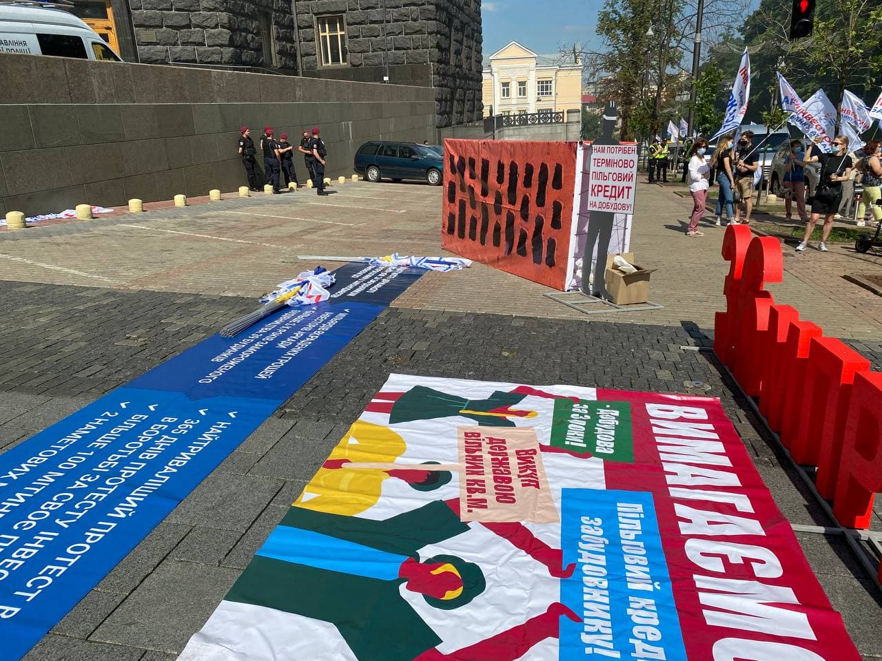Також під будівлею Кабміну забралася майже сотня мітингувальників з прапорами "Інвестори банку "Аркада". Вони тримають у руках плакати: "Інвестори вимагають свої квартири", "Вимагаємо кредит 3,6 млрд грн", "Вимагаємо: добудова за 3 роки", "Досить чекати! Треба будувати!".