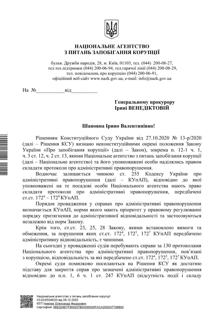 Голова Національного агентства з питань запобігання корупції (НАЗК) Олександр Новіков звернувся до генеральної прокурорки України Ірини Венедіктової щодо закриття справ про недостовірне е-декларування судами на підставі рішення Конституційного суду України (КСУ).