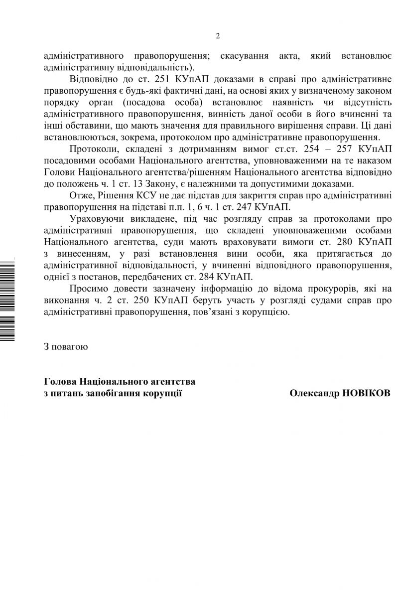 Новіков звернуся до Венедіктової та голови Верховного суду Валентини Данішевської щодо порушення суддями окремих судів Закону України "Про запобігання корупції". Покарання в рамках цього закону можливе, а суди без з'ясування обставин правопорушень закривають справи.