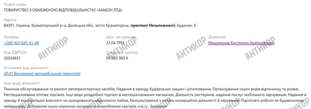 Що стосується ТОВ «Макон ЛТД», то навіть перелік основних видів діяльності компанії викликав здивування: технічне обслуговування та ремонт автотранспортних засобів; надання в оренду будівельних машин та обладнання; інші види відпочинку та розваг; неспеціалізована оптова торгівля; інші види роздрібної торгівлі в неспеціалізованих магазинах; ресторани, послуги мобільного харчування і так далі. І лише останнім рядком йшла розробка кар’єрів.