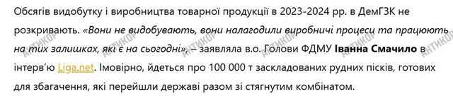 Про те, що відбувалося під час контролю над Демурінським ГЗК представників держави у 2023-2024 роках, відомостей надзвичайно мало. Але, як випливає зі слів в.о. голови Фонду держмайна Ірини Смачило, підприємство, швидше за все, переробляло заскладовані рудні піски, а видобуток не вівся.