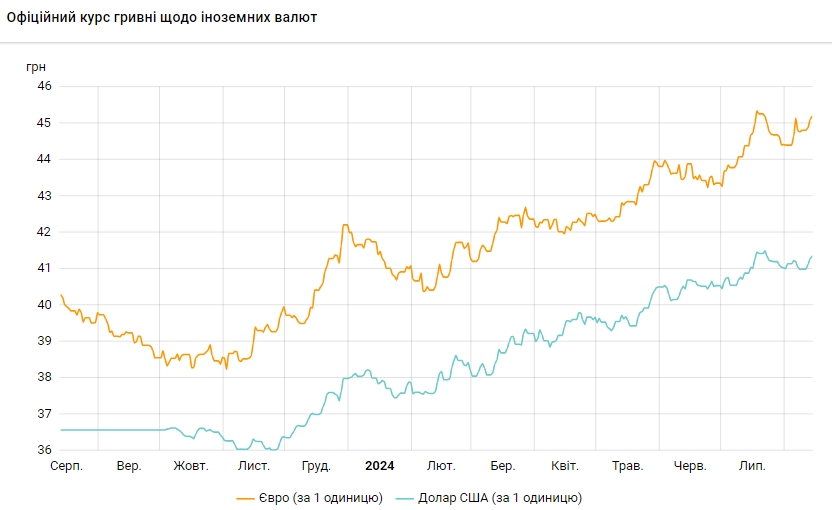 Станом на 14 серпня 2024 року офіційний курс встановлено на рівні 41,3464 гривень за долар, що на 6,34 копійки більше, ніж попереднього дня.