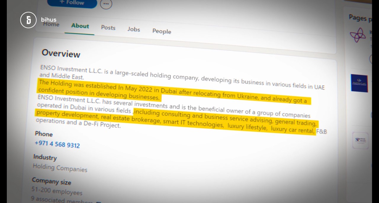 Компанія ENSO INVESTMENT вказана на платформі LinkedIn, де зазначено, що вона переїхала з України до ОАЕ в травні 2022 року. Компанія займається консультуванням бізнесу, розвитком нерухомості, IT-технологіями та прокатом розкішних автомобілів. Інша компанія, ENSO DEVELOPMENT, має вебсайт із логотипом, схожим на той, що використовується українською будівельною компанією ENSO.