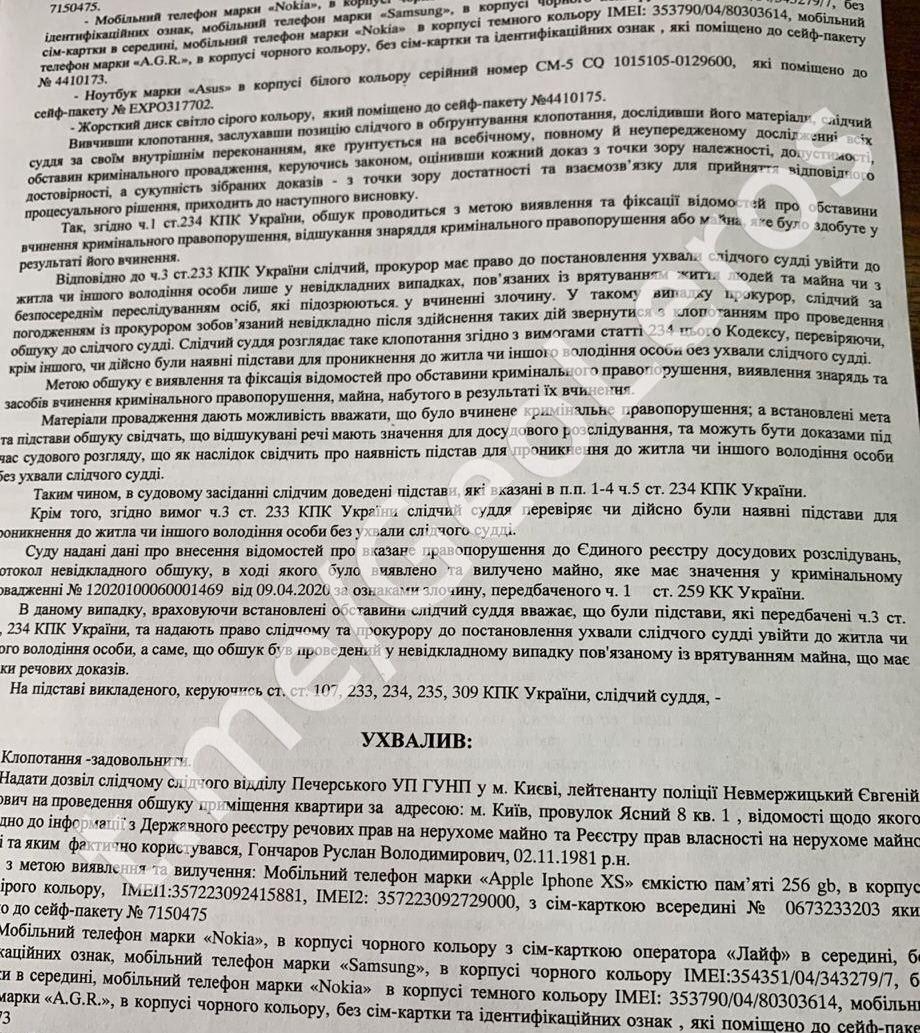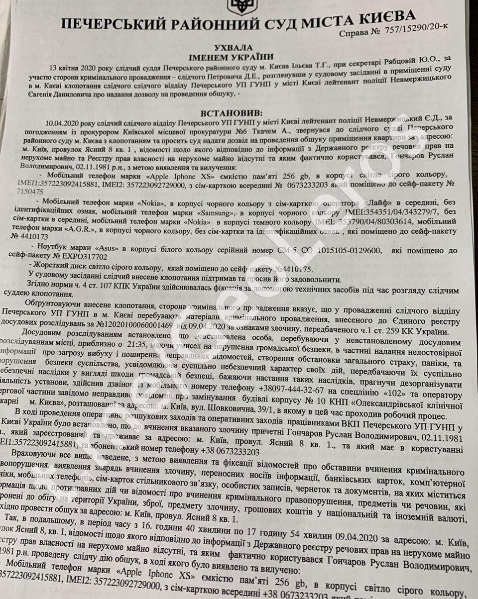 Народний депутат, якого скандально виключили зі "слуг", Гео Лерос опублікував рішення Печерського районного суду Києва, в якому йдеться, що дзвінок про мінування Олександрівської лікарні здійснили з телефону Руслана Гончарова, який є помічником нардепа "Слуги народу" Миколи Тищенка.