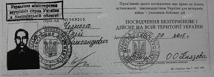 Одним з аргументів на свою користь люстрований Чернега використав посвідчення учасника Антитерористичної операції, яке отримав 16 вересня 2015 року — за два тижні після повторного наказу про звільнення. За даними видання, Чернега не брав участі в бойових діях, а формально отримав статус учасника АТО за кілька днів перебування в «мирній» зоні.