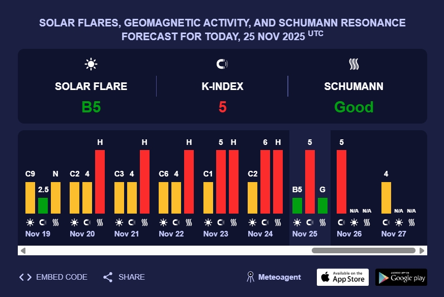 У вівторок, 25 листопада, прогнозується геомагнітна буря з К-індексом 5. Це відповідає сильному рівню сонячної активності, що може впливати на роботу електронної техніки, супутникових комунікацій, а також на здоров’я людей, особливо метеозалежних.