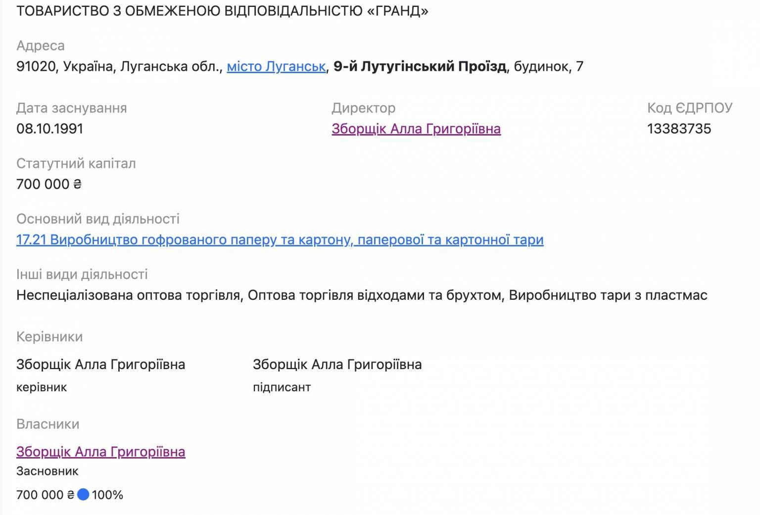 Виявилося, що її родичка також є власником ТОВ «Гранд» (13383735). Ця фірма займається виробництвом тари з пластмас й паперової продукції та знаходиться у місті Луганськ за адресою 9-й Лутугінський Проїзд, 7. Алла Зборщік є єдиним власником фірми з внеском в 700 тис. гривень.