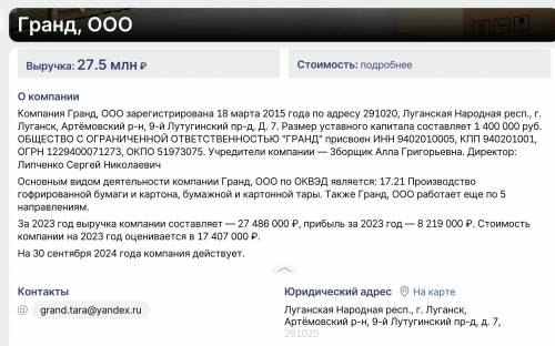 Компанія «Гранд» знаходиться за тою ж самою адресою, що і за українською реєстрацію. Вказується, що за минулий рік дохід компанії склад 27,48 млн рублів, а прибуток — 8,2 млн рублів. На підприємстві начебто працюють 10 робітників. Керує фірмою дехто Сергій Ліпченко.