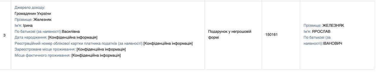 Вказується, що подарунок у негрошовій формі політику від матерів вартував 150161 грн.