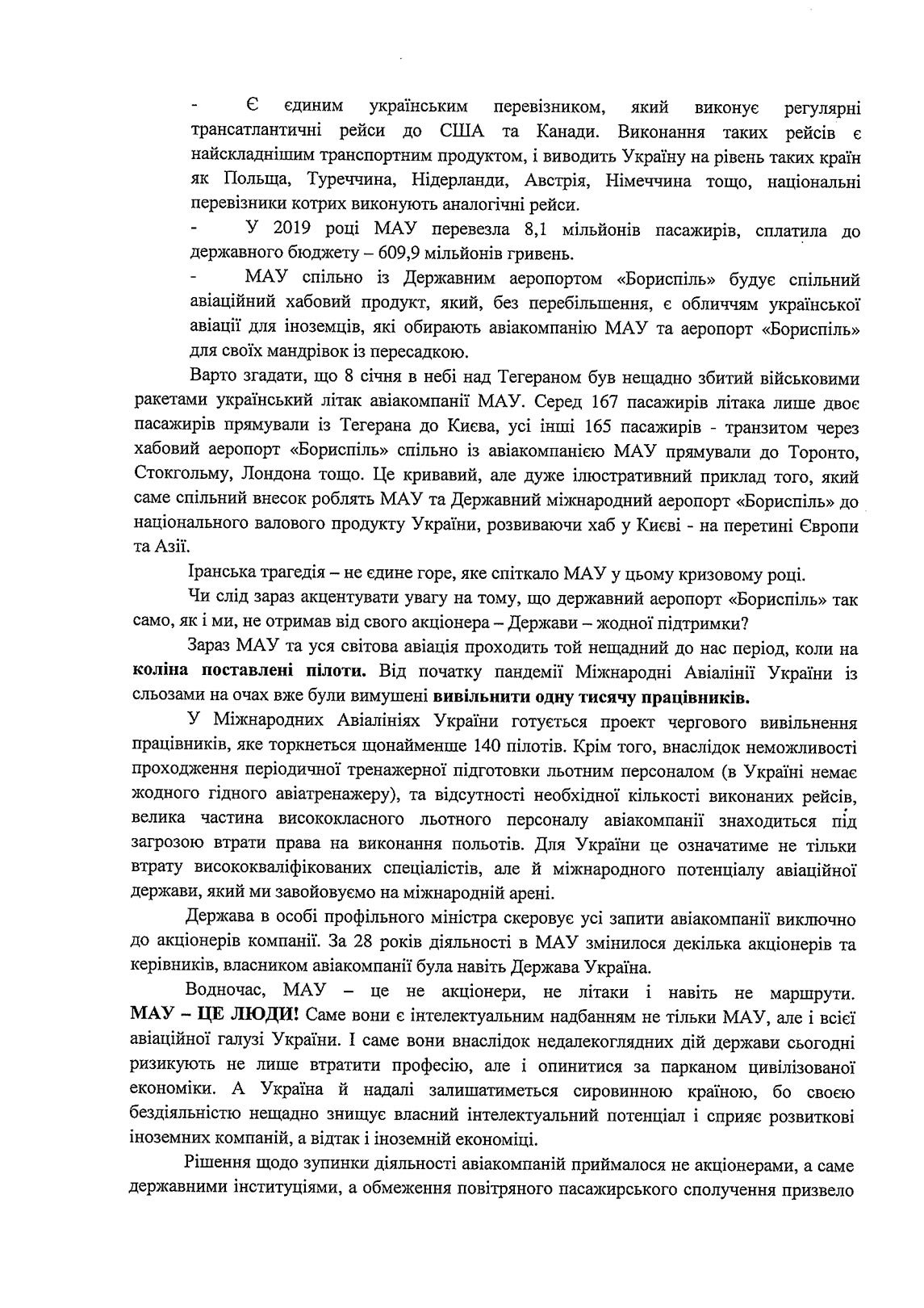 У зверненні МАУ зазначається, що держава в особі профільного міністра скеровує усі запити щодо підтримки авіакомпанії виключно до акціонерів.