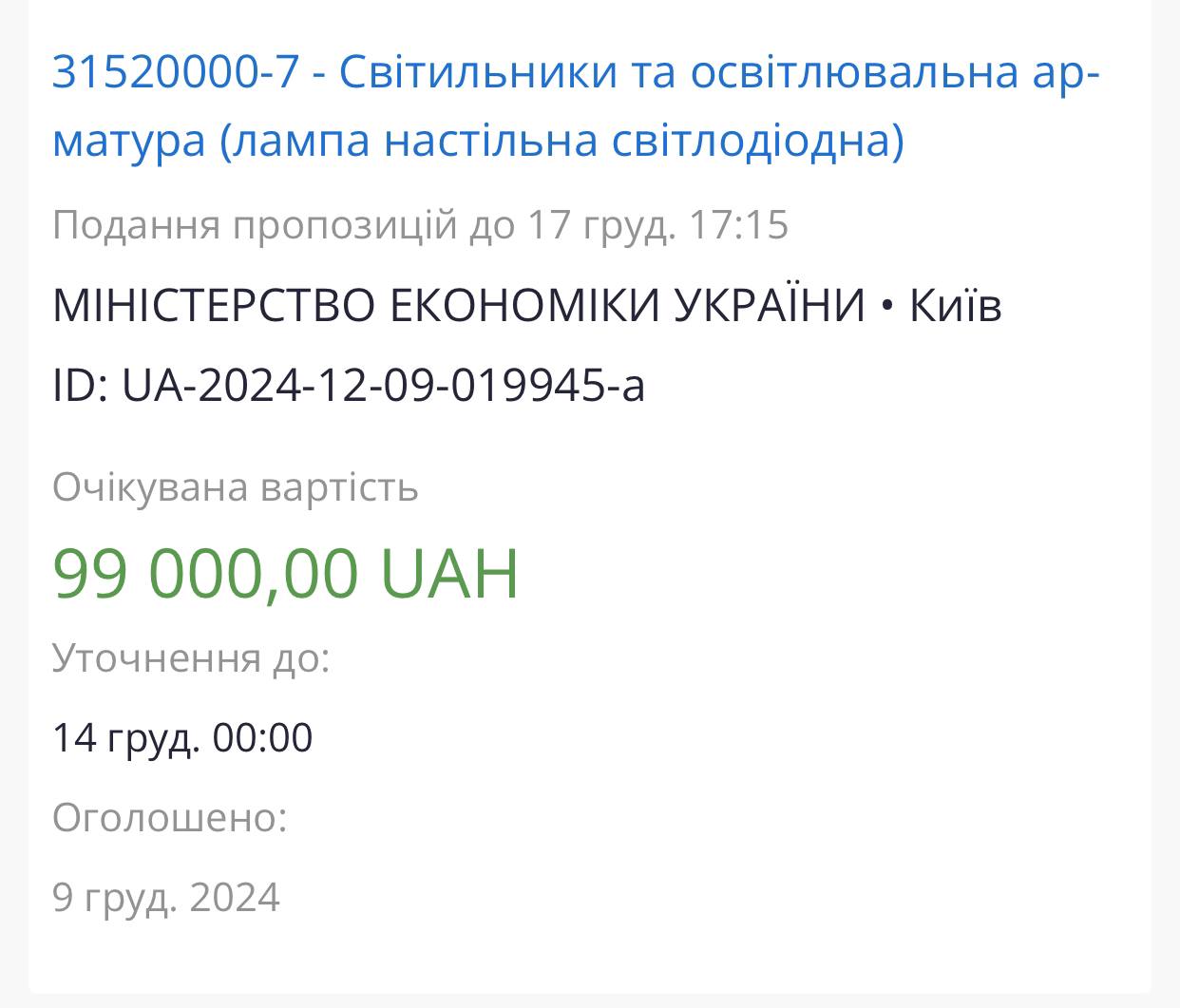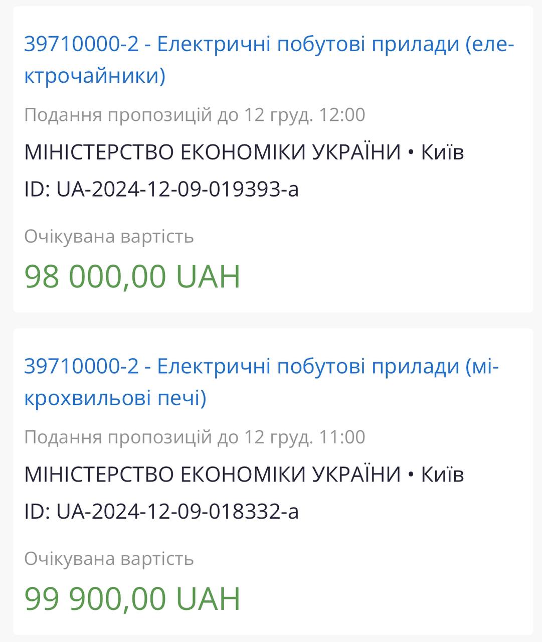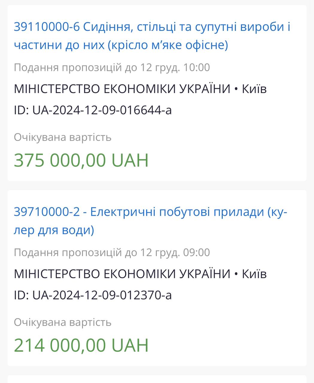 У переліку закупівель зокрема стільці за 375 тисяч гривень, мікрохвильові печі за 100 тисяч, електрочайники за аналогічною ціною, кулер за 214 тисяч та настільні лампи знов таки за 100 тисяч гривень.