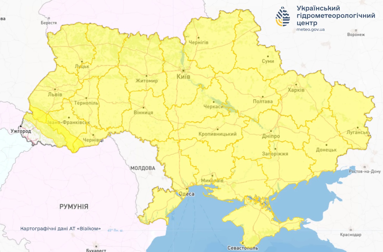 Водночас можливі пориви вітру в усіх регіонах України, окрім Закарпаття, зі швидкістю – 15 – 20 метрів на секунду. Через це майже по всій Україні оголосили I рівень небезпечності, жовтий.