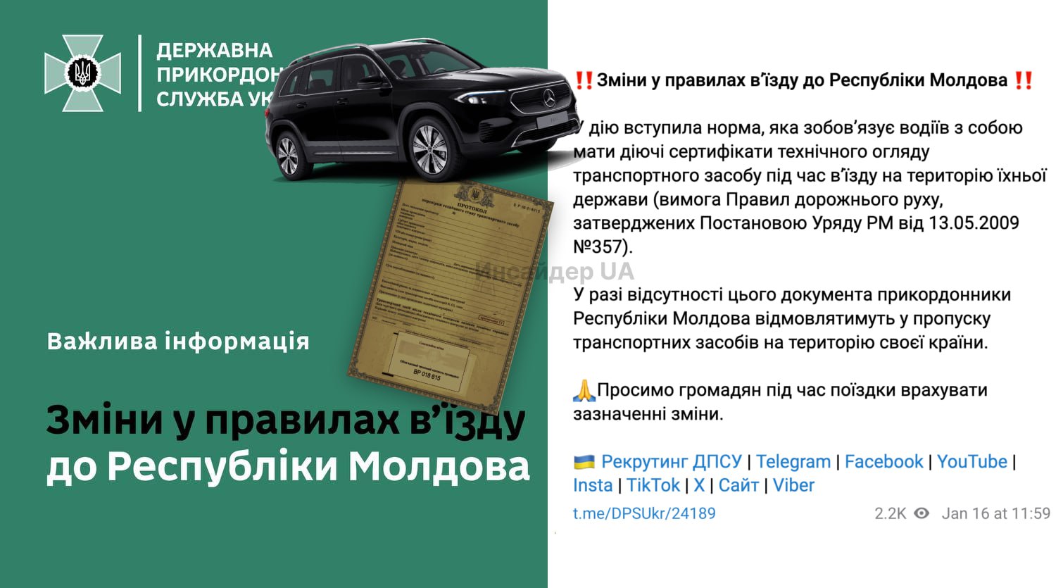 "У дію вступила норма, яка зобов’язує водіїв з собою мати діючі сертифікати технічного огляду транспортного засобу під час в’їзду на територію їхньої держави (вимога Правил дорожнього руху, затверджених Постановою Уряду РМ від 13.05.2009 №357)", - сказано у повідомленні.
